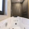 Das große, sehr geräumige Badezimmer verfügt über eine Whirlpool-Badewanne, eine bodengleiche Dusche, eine Infrarot-Sauna und ein breites Waschbecken mit zwei Armaturen.