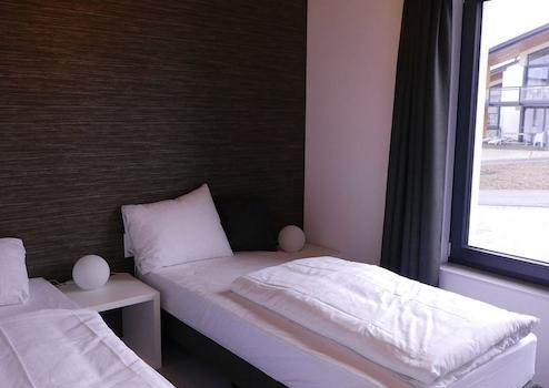 Schlafzimmer 1 unterscheidet sich von allen anderen Villen im Park. Anstelle eines Etagenbetts finden Sie hier eine maßgefertigte Schlafgalerie (Vide) mit einem gemütlichen Doppelbett oben. Unter der Galerie gibt es ein zusätzliches Schlafsofa für Kinder mit TV und DVD-Player.