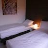 Dieses Schlafzimmer befindet sich an der Vorderseite der Villa und verfügt über große Dreh-Kipp-Fenster mit Vorhängen. Hier stehen zwei Einzelbetten, Nachttische und eine eingebaute Schrankwand.