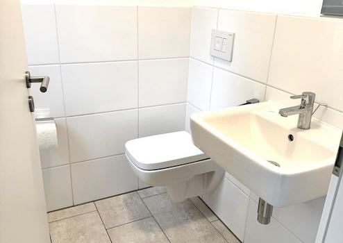Im Erdgeschoss befindet sich neben dem Hausflur/Eingangsbereich ein Gäste-WC mit Fenster, ein Abstell-/Technikraum sowie eine großzügige Küche und das Wohnzimmer mit Essbereich.