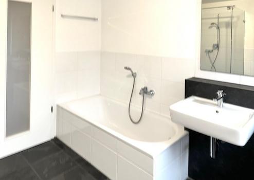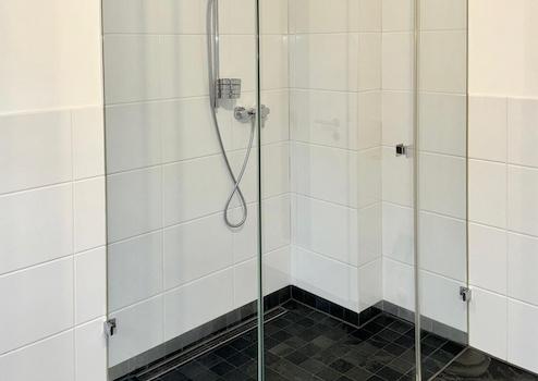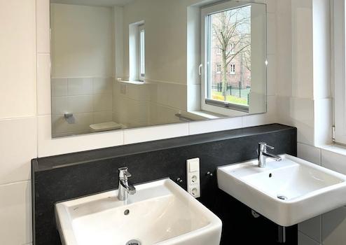 Das Bad verfügt über eine große, ebenerdige Dusche mit Echtglaswand, eine Badewanne, Toilette sowie 2 separate Waschbecken.