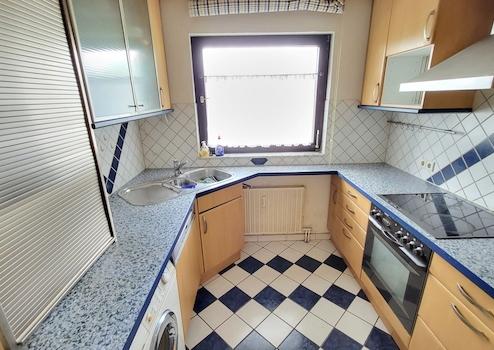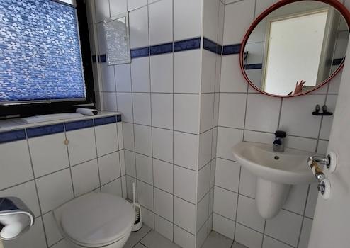 Wieder Richtung Diele/Küche befinden Sie die weiteren Räumlichkeiten, welche Sie über einen offenen Rundbogen betreten. Links ist ein weiterer Abstellraum und geradeaus gehend das innenliegende und recht geräumige Badezimmer angeordnet. Das Familien-Badezimmer ist in den Farben weiß und blau gehalten und ebenfalls raumhoch gefliest. Neben einer Runddusche stehen Ihnen hier noch zwei Waschbecken, ein Handtuchheizkörper und ein Waschmaschinenanschluss zu Verfügung. Abschließend betreten Sie - daran angrenzend - das Schlafzimmer, welches zum Laubengang hin ausgerichtet ist und bequem Platz für Ihre Doppelbettanlage, Kleiderschrank und weiteres Mobiliar bietet. Zwei Fenster erhellen diesen Raum angenehm.