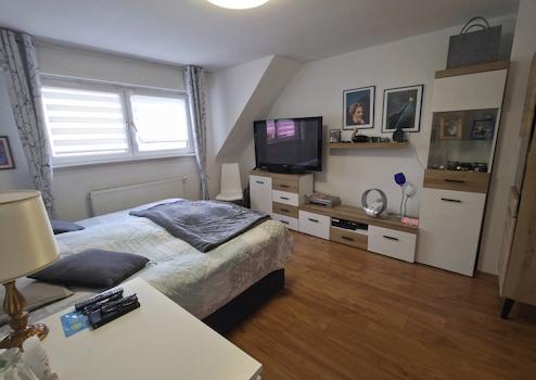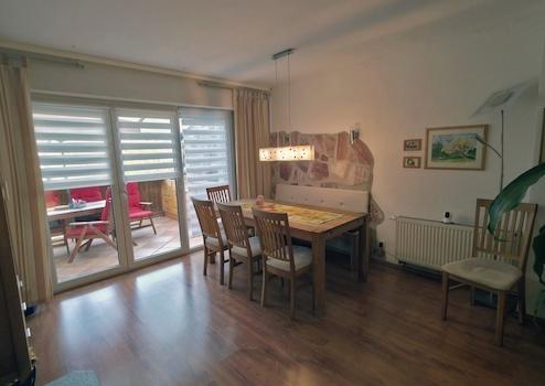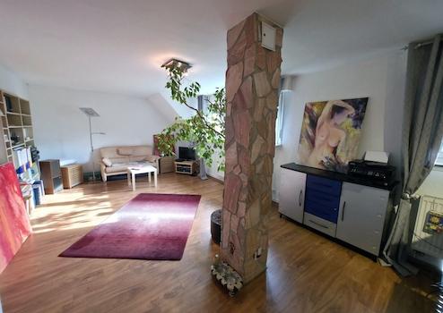 Das erste Obergeschoss in Verbindung mit dem Dachgeschoss wurde zu einer attraktiven Maisonette-Wohnung umgebaut. Auf der unteren Ebene befinden sich die praktisch geschnittene, voll ausgestattete Küche, ein separates Esszimmer mit Zugang zum großen Balkon, ein gemütliches Wohnzimmer, ein Schlafzimmer sowie ein Tageslicht-Duschbad.