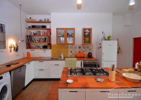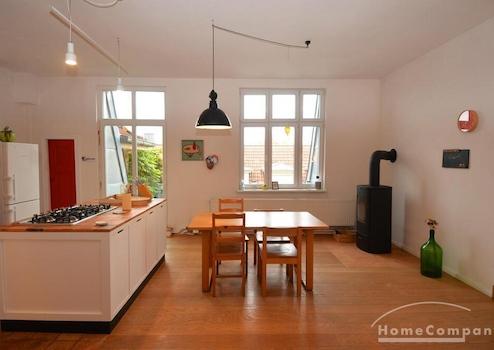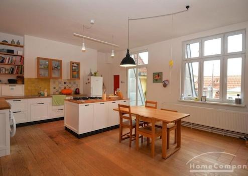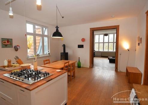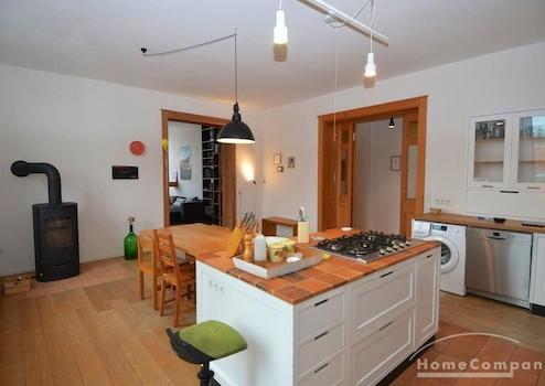 Große 40qm Wohnküche mit Kücheninsel, Gaskochfeld und Eichenholz-Tisch. Hier befindet sich auch ein Kaminofen für gemütliche Abende am Kamin. Die gesamte Wohnung ist mit soliden Esche-Dielen und Holzparkett ausgelegt. Das große Badezimmer ist mit Dusche und Badewanne ausgestattet.