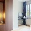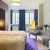 Das Schlafzimmer verfügt über ein komfortables King-Size-Bett, einen Arbeitsbereich, einen großzügigen Kleiderschrank sowie einen Lounge-Sessel und direkten Zugang zum Balkon.