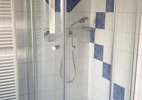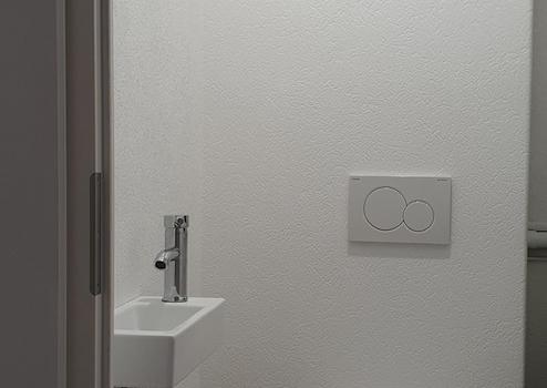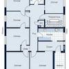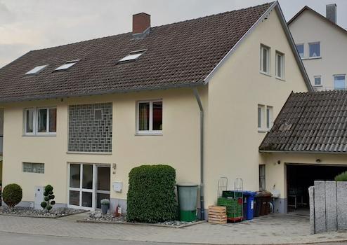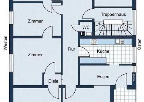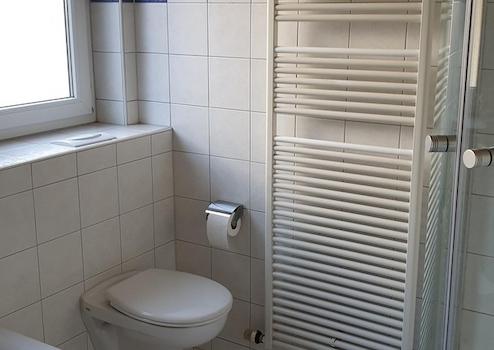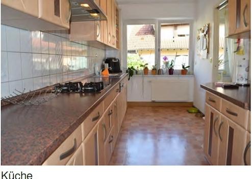 Einbauküche mit Gasherd, Bad mit Dusche und Badewanne und WC, Gäste-WC. Außer Bad und Küche verfügt noch ein weiterer Raum über Sanitäranschlüsse. Dieser kann als großer Hauswirtschaftsraum genutzt werden. Ein KFZ-Stellplatz befindet sich unmittelbar am Haus (50 € monatlich extra). Ein Keller ist nicht vorhanden. In begrenztem Umfang kann jedoch die vorhandene Doppelgarage für z.B. Fahrräder / Reifen etc. mit benutzt werden.