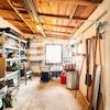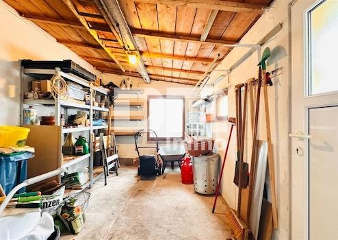 Hier verortet sind die große Garage mit Doppelflügel-Schwingtor (Stahl), ein Geräteschuppenanbau nebst HWR, ein kleiner Hobbyraum, eine Sommerküche sowie eine beheizbare Werkstatt (Ofen).