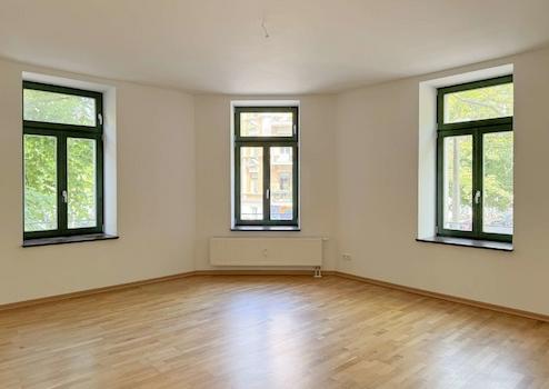 Ein Highlight der Wohnung ist das große Eckwohnzimmer mit drei Fensterachsen. Die tiefliegenden Fensterbänke bieten nicht nur Platz für Deko oder Pflanzen, sondern auch Sitzmöglichkeiten mit Blick ins Grüne. Der hochwertige Parkettboden sorgt in allen Wohnräumen für ein stilvolles Wohnklima. Das Schlafzimmer ist klassisch geschnitten und gut zu möblieren.