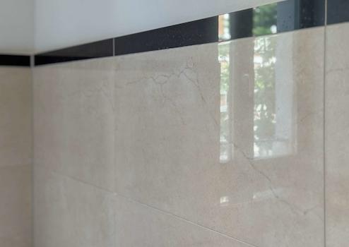 Das angrenzende Tageslichtbad verfügt über eine Badewanne, Waschmaschinenanschluss, Handtuchheizkörper sowie Fliesen in eleganter Marmor-Optik.