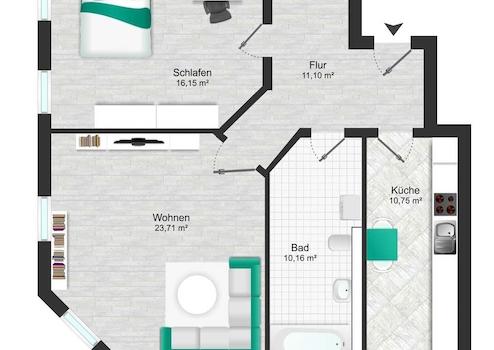 Die Raumaufteilung ist funktional und bietet vielseitige Nutzungsmöglichkeiten. Der großzügige Flur schafft eine angenehme Eingangssituation mit Platz für Garderobe und Stauraum. Die Küche ist in zeitloser Schwarz-Weiß-Optik gehalten. Auf Wunsch stellt der Eigentümer gegen Aufpreis eine Einbauküche zur Verfügung.