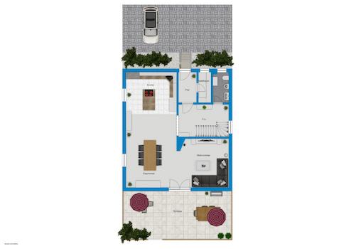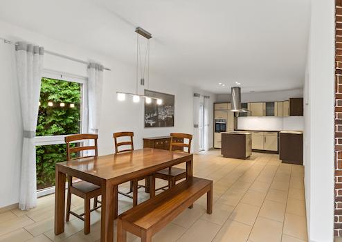 Im Erdgeschoss erwartet Sie ein beeindruckend großes Wohn- und Esszimmer mit Kamin und direktem Zugang zur Sonnenterrasse und dem liebevoll angelegten Garten. Die offene Raumgestaltung verbindet den Essbereich harmonisch mit der modernen Einbauküche. Eine großzügige Diele sowie ein Gäste-WC vervollständigen das Erdgeschoss.