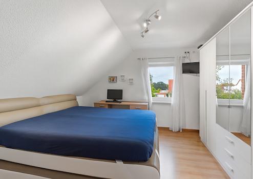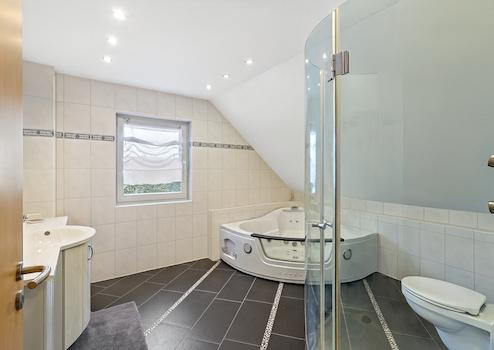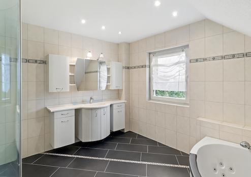 Im Obergeschoss befinden sich drei geräumige Schlafzimmer sowie ein äußerst großzügiges Badezimmer mit Eckbadewanne und Dusche – perfekt für entspannte Stunden.
