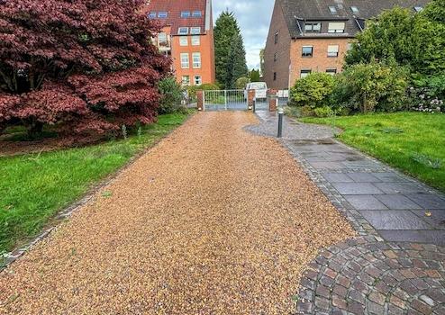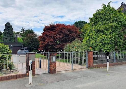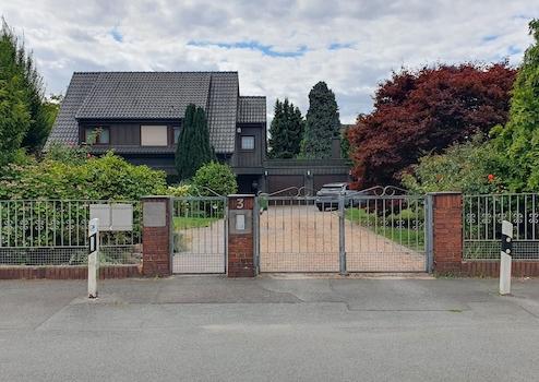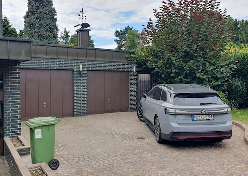 Das Grundstück ist vollständig eingezäunt und mit einer Toranlage zur Straße gesichert. Eine lange Einfahrt führt zur Doppelgarage, sodass ausreichend Stellfläche für mehrere Fahrzeuge vorhanden ist.