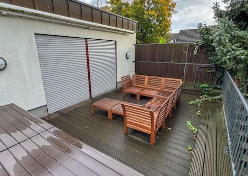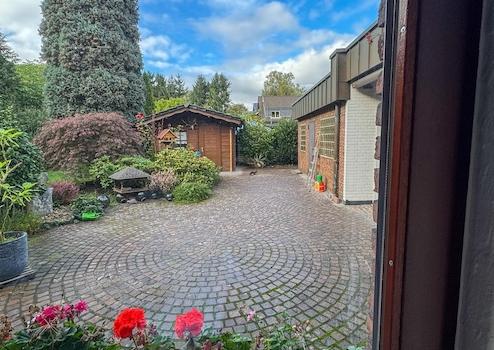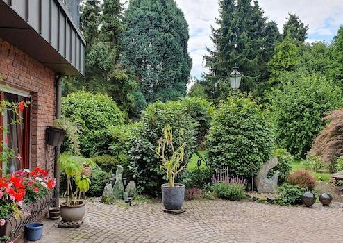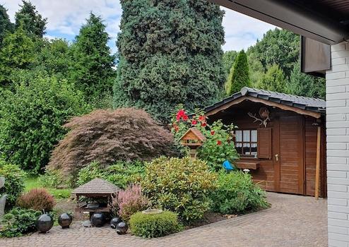 Der große Garten mit Süd-West-Ausrichtung ist liebevoll gepflegt und bietet vielfältige Gestaltungsmöglichkeiten. Eine großzügige, gepflasterte Terrasse mit überdachtem Freisitz lädt zum Entspannen ein, während das Gartenhaus mit integrierter Sauna und Infrarotkabine einen privaten Wellnessbereich schafft. Die obere Wohneinheit verfügt über eine großzügig nach Süden Orientierte Dachterrasse. Von dort aus gelangt man über eine Außentreppe ebenfalls in den Garten.