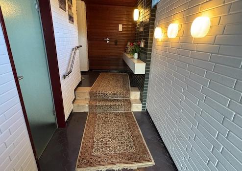 Die Erdgeschosswohnung bietet ca. 136 m2 Wohnfläche mit drei Zimmern, einer Küche, einem separaten WC sowie einem Badezimmer mit Dusche, das angrenzend an die Terrasse liegt und somit von außen zugänglich ist. Im Wohnzimmer sorgt ein gemütlicher Kamin für eine behagliche Atmosphäre. Der Bodenbelag besteht überwiegend aus Fliesen, teilweise aus hochwertigen Natursteinfliesen, was dem Haus ein gepflegtes und zeitloses Erscheinungsbild verleiht.