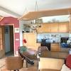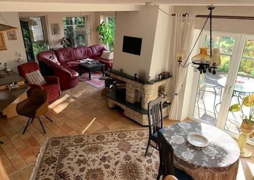 Mittelpunkt des Hauses ist das sonnige Wohnzimmer mit Küche, Essbereich, Fußbodenheizung und Kamin. Von hier haben Sie den direkten Zugang zur Terrasse, zum Garten und dem Schwimmteich. Wie wäre es mit einem Sprung ins kühle Nass gleich nach dem Frühstück?