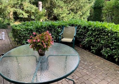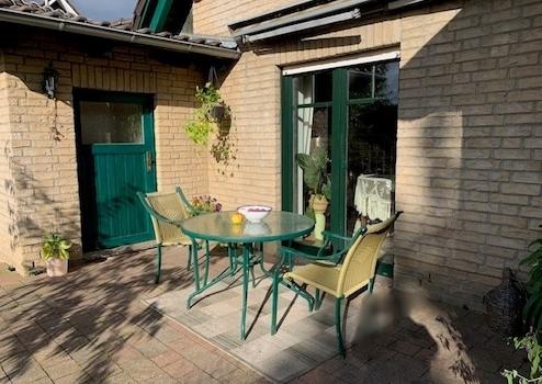 Es gibt mehrere Sitzecken auf dem Grundstück und eine die geschützte Frühstücksecke an der Ostseite des Hauses. Ein großzügiger Carport gehört dazu.