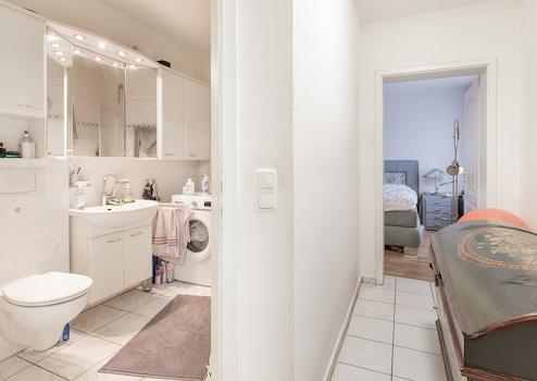 - Modern gefliestes Duschbad mit Badmöbeln und Waschmaschinenanschluss