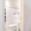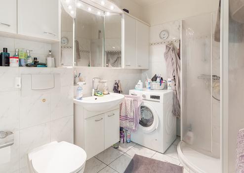 Das Badezimmer hat moderne, helle Wand- und Bodenfliesen. Neben einer Runddusche mit Duschkabine verfügt es über ein Hänge-WC, einen Waschtisch und weiße Badezimmermöbel. Ein Waschmaschinen-Anschluss vervollständigt den positiven Gesamteindruck. Für Gäste steht ein separates, weiß gefliestes WC zur Verfügung.