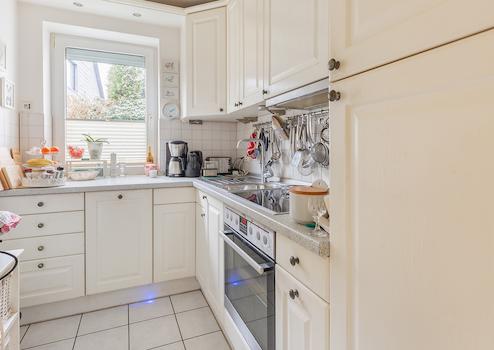 Die Küche ist mit einer schicken Einbauküche im Landhausstil versehen. Die Schränke haben weiße Fronten, die Arbeitsplatte ist grau. Ausgestattet ist die Einbauküche mit allen erforderlichen Elektrogeräten sowie zahlreichen Ober- und Unterschränke, die viel Stauraum bieten. Darüber hinaus gibt es eine attraktive Arbeitsplattenbeleuchtung.