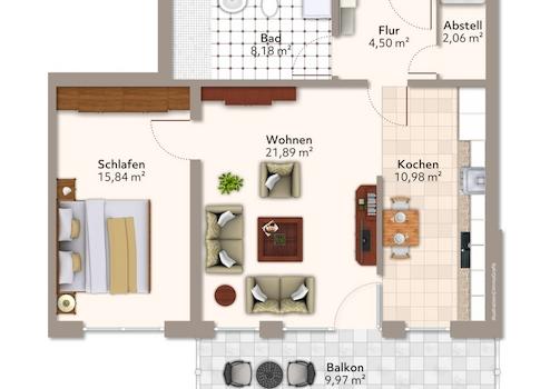 Die attraktive Zuschnitt der Wohnung ist Ergebnis langjähriger Erfahrungen, verwirklichen wiederkehrende Interessentenwünsche und berücksichtigen bereits eine Vielzahl der modernsten Möglichkeiten bei der Innenausstattung.
