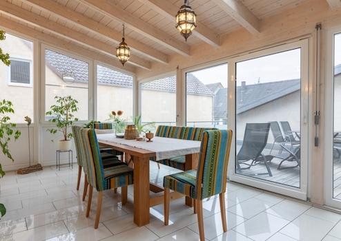 Im Erdgeschoss befindet sich eine moderne, neuwertige Küche, von der aus sowohl der Wintergarten und die windgeschützte Terrasse als auch das Badezimmer und die gemütliche Wohnstube mit traditionellem Kachelofen erreichbar sind. Die Küche bildet hier sprichwörtlich den Dreh- und Angelpunkt des Hauses.