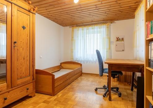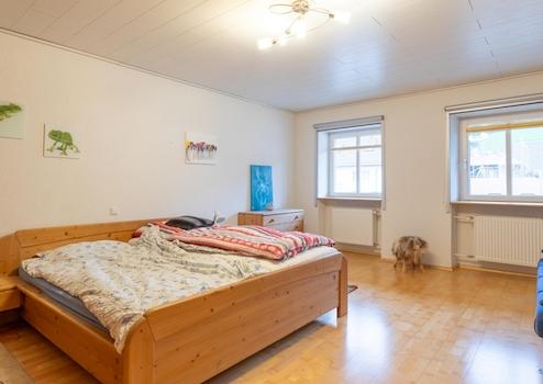 Über das Treppenhaus gelangt man in das Obergeschoss mit zwei Schlafzimmern, einem großen Wohnzimmer, einer derzeit als Waschküche genutzten Küche sowie einem separaten Trakt mit Bad und WC. Im ausgebauten Dachgeschoss stehen zwei großzügige Schlafzimmer zur Verfügung, eines davon mit eigenem Bad.