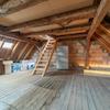 Das Obergeschoss bietet ein sehr großzügiges Wohnzimmer mit offener Holzbalkendecke und Holzparkettboden. Zudem stehen zwei weitere Schlafzimmer zur Verfügung. Die über einen separaten Flur zugänglichen Sanitärräume stammen noch aus den 1980er Jahren und müssten sicherlich modernisiert werden. Die ehemalige Küche im Obergeschoss wird aktuell als funktionale Waschküche genutzt.