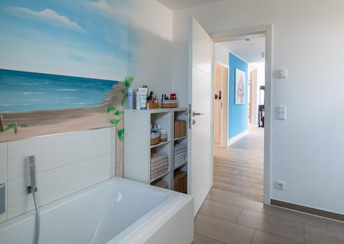 Das Einfamilienhaus wurde 2013/14 auf dem 746 m² großen Grundstück errichtet und verfügt über rund 195 m² Wohnfläche, verteilt auf 2 Etagen. Der große Eingangsbereich, von dem Türen ins Gäste-WC, ein großes Bad (mit Wanne und Dusche) sowie 2 weitere Zimmer führen (Schlafen, Arbeiten...), öffnet sich zum eindrucksvollen Wohn-Essbereich. Das offen gestaltete Wohnzimmer mit riesiger Fensterfläche gibt den Blick bis unters Dach frei und schafft damit ein einzigartiges Raumgefühl. Ein Kaminofen sorgt für zusätzliche, wohlige Atmosphäre. Es gibt einen großen Durchgang zum Esszimmer und zur Küche, die mit einem zentralen Küchenblock und qualitativ-hochwertiger, modernster Küchentechnik ausgestattet ist. Angeschlossen an die Küche ist ein Hauswirtschaftsraum. Von fast allen Räumen im EG gibt es einen direkten Zugang nach außen, zum Garten bzw. zur Terrasse. Eine mit Glas verkleidete Treppe im Wohnraum führt ins DG, wo neben einer Galerie 2 große Zimmer (Schlafen, Kinder, Gäste...) sowie ein weiteres Bad zu finden sind. Das Bad (in Planung/Rohbau) wird von den jetzigen Eigentümern noch fertiggestellt. Die hochwertige Küche, der Kaminofen sowie alle Einbauschränke (vom Fachmann individuell hergestellt und maßgerecht eingebaut) sind im Kaufpreis enthalten. Alle Wohnräume verfügen über Fußbodenheizung, die von einer Erdgas-Zentralheizung versorgt wird. Zusätzlich wird das Warmwasser mit Solarthermie erzeugt. Alle Fenster sind 3-fach verglast.