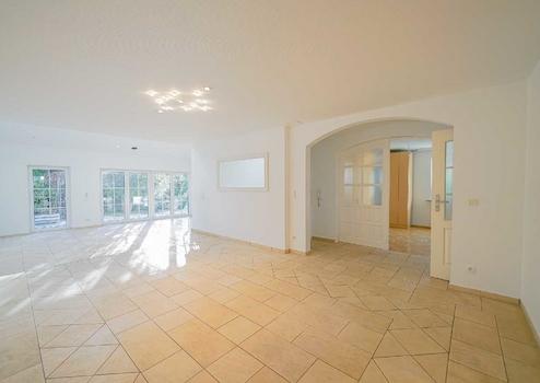 Über die großen, bodentiefen Fenster gelangen Sie auf die Terrasse mit Blick in den schönen Garten.