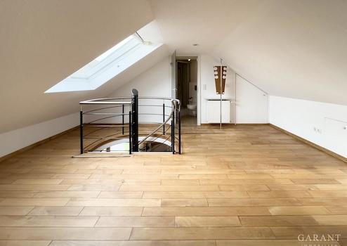 Die Wohnung im Obergeschoss erstreckt sich über zwei Ebenen und überzeugt mit einem modernen Grundriss sowie lichtdurchfluteten Räumen. Das Dachgeschoss wurde im Jahr 2002 vollständig ausgebaut, somit beherbergt die Wohnung zwei stilvolle Badezimmer, eines davon komplett neuwertig. Besonders hervorzuheben sind die beiden Balkone, die herrliche Rückzugsorte im Freien bieten. Mit ihrer offenen Gestaltung und der neuen Einbauküche präsentiert sich die Wohnung im Obergeschoss in einem absolut neuwertigen Zustand und wurde bislang nicht bewohnt.