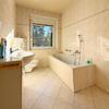 Über die verglaste Eingangsveranda gelangt man in das zentrale Wohnniveau. Auf der rechten Seite befinden sich die großzügige Küche mit Blick in den Garten sowie das helle Tageslichtbad ausgestattet mit Badewanne und Dusche. Das Schlafzimmer liegt direkt dahinter und profitiert von der ruhigen Gartenausrichtung.