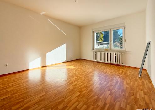 Zur linken Seite öffnet sich das Wohnzimmer, das durch große Fensterflächen viel Licht erhält und über einen Durchgang in ein weiteres Zimmer führt – ideal als Arbeits-, Gäste- oder Kinderzimmer nutzbar.