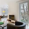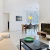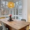 Die Wohnung beeindruckt durch ihre großzügigen bodentiefen Fenster, die den Wohnraum in warmes Tageslicht tauchen.