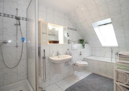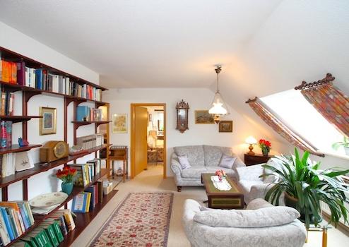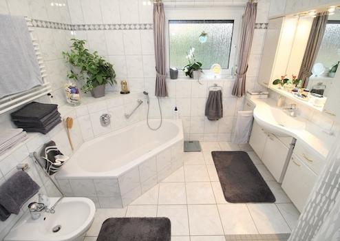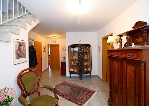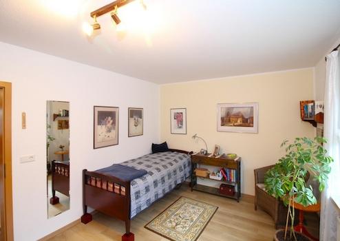 Im Erdgeschoss erwarten Sie ein weitläufiges Wohnzimmer mit Kachelofen sowie ein anliegendes Esszimmer mit Erker und Zugang zu der überdachten Terrasse. Die Einbauküche ist vollausgestattet und gut zugänglich. Ein Schlafzimmer, ein Tageslichtbad mit Dusche, Badewanne und Bidet, eine großzügige Eingangsdiele und ein Hauswirtschaftsraum runden die untere Etage ab. Das Dachgeschoss bietet einen großzügigen Flur, zwei weitere Zimmer, ein weiteres Tageslichtbad mit Dusche und Badewanne sowie einen großen Abstellraum.