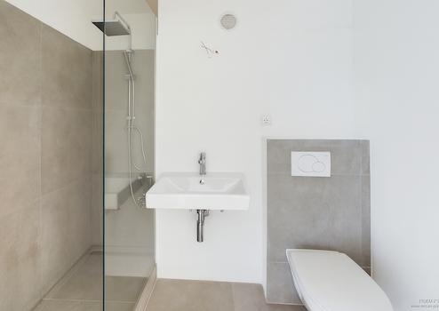 Das stilvolle Badezimmer ist mit einer modernen Duschkabine ausgestattet und rundet das zeitgemäße Wohnkonzept ab.