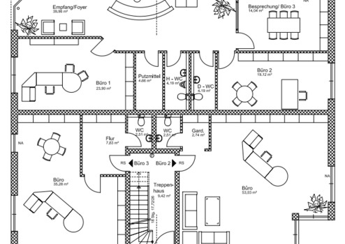 Auch die Gewerbeeinheiten sind gepflegt und modern ausgestattet. Eine der drei Büroeinheiten sowie die 100 m² Wohnung verfügen über Klimaanlagen und eine Alarmanlage – ein zusätzliches Plus an Komfort und Sicherheit für gewerbliche Nutzung.