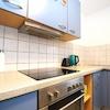 Die praktische und gepflegte Küche verfügt über einen Herd, einen Backofen, einen Kühlschrank, eine Spülmaschine und ein Spülbecken.