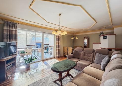 Im Erdgeschoss befindet sich ein großzügiges, lichtdurchflutetes Wohnzimmer mit Kamin, das direkten Zugang zur überdachten Terrasse bietet. Hier lassen sich sowohl gemütliche Abende am Kaminfeuer als auch gesellige Stunden im Freien genießen.