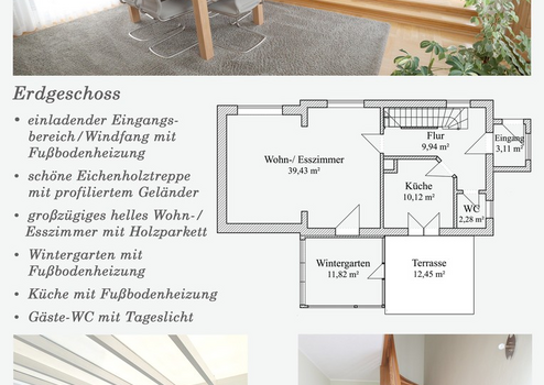 Über einen klar strukturiert Eingangsbereich mit Windfang und Garderobe gelangt man zu den Räumen im Erdgeschoss. Im großzügigen Wohn-Esszimmer mit Zugang zum Wintergarten und der Terrasse, kann man den Tag entspannt ausklingen lassen. Das Holzparkett verleiht hier dem lichtdurchfluteten Wohnraum eine angenehme Atmosphäre. Die kompakte Küche, gut nutzbar und mit klarer Trennung vom Wohnbereich, hat ebenfalls einen Zugang zur Terrasse und dem Garten. Zudem gibt es noch ein funktionales Gäste-WC.