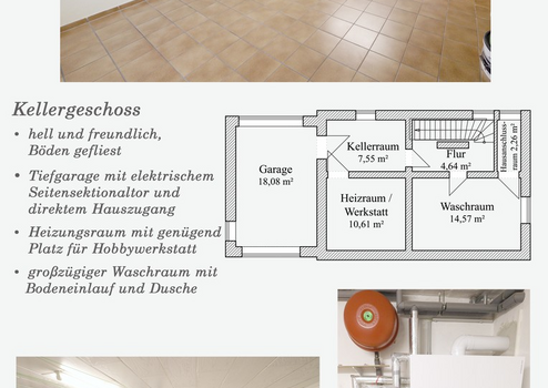Im Keller befindet sich neben der Haustechnik und genügend Stauraum auch ein Waschraum für Wäsche inklusive einer weiteren Dusche. Zudem gibt es hier praktischerweise einen Zugang zur Tiefgarage, in welcher bequem ein Pkw und Fahrräder untergebracht werden können. Ein weiterer Pkw-Stellplatz befindet sich auf dem Grundstück.