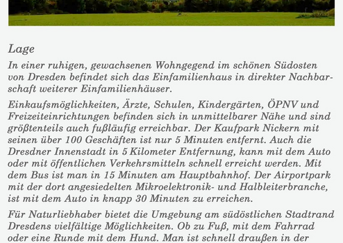 Das Haus besticht insbesondere durch seine attraktive Lage. Es befindet sich in einer ruhigen, gewachsenen Wohngegend am südöstlichen Stadtrand von Dresden in Nachbarschaft weiterer Einfamilienhäuser. Zudem ist es verkehrstechnisch sehr gut angebunden.