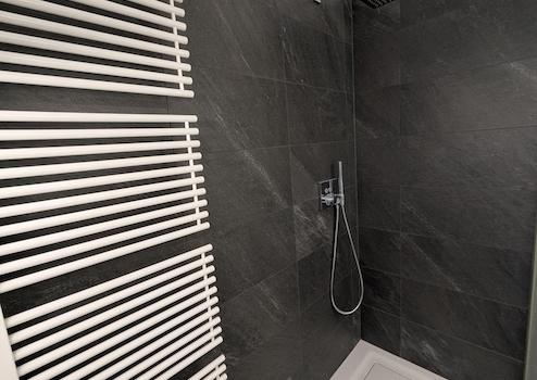 Ein Wannenbad inkl. Dusche en suite mit Handtuchheizkörper und zusätzlicher elektrischer Fußbodenheizung sorgt für maximalen Komfort. Sowie ein separates Gästebad mit Dusche, ebenfalls mit hochwertigen Fliesen, Handtuchheizkörper und elektrischer Fußbodenheizung ausgestattet.
