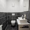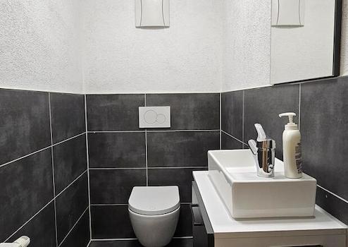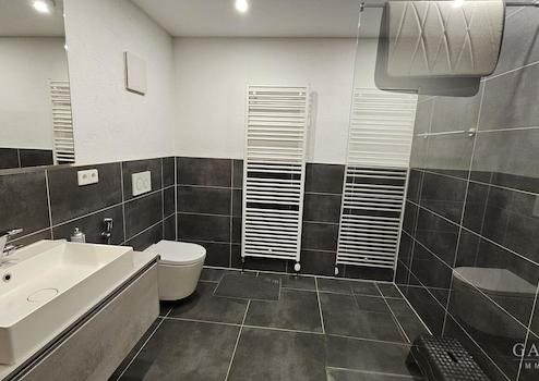 Neuer, moderner Sanitärbereich: Stilsicheres Bad-Design mit hochwertigen Armaturen sowie eine zusätzliche Gästetoilette für mehr Komfort im Alltag.