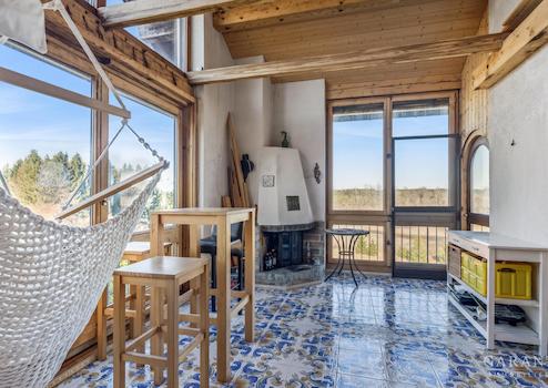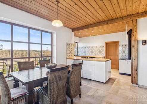 Die Hauptwohnung erstreckt sich mit ca. 217 qm Wohnfläche über zwei Ebenen. Im Erdgeschoss öffnet sich ein lichtdurchfluteter Wohn- und Essbereich mit Kachelofen, dazu ein Wintergarten und ein Balkon mit Panoramablick ins Grüne. Eine offene Küche mit Speis und Holzofen, ein Schlafzimmer mit Ankleide, ein stilvolles Bad sowie ein Gäste-WC ergänzen diese Ebene.
