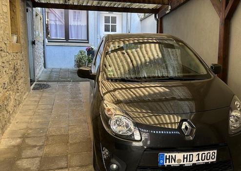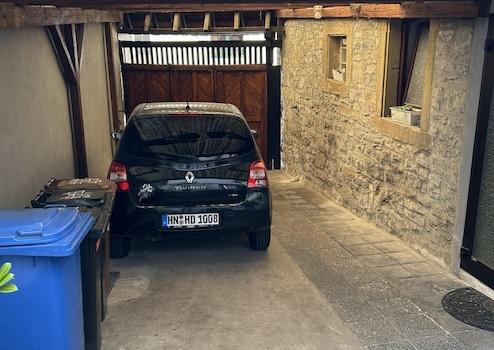 Ein Hinterhof mit Garagenplatz für ein Fahrzeug ist vorhanden.