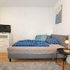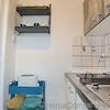 The apartment has been freshly renovated and refurnished, with high-quality laminate flooring in a modern wood look, and offers a living room/bedroom, a small separate kitchen, a bathroom with natural light, and a balcony. The living room has a comfortable 1.40 x 2.00 m bed, an extra-large wardrobe, a chest of drawers, and a bedside table with a lamp. The harmonious color scheme in gray, blue and black is reflected in all the decorations and accessories. The bright fitted kitchen with two hotplates and a refrigerator with freezer compartment is equipped with all the necessary cooking utensils and crockery. The bathroom has a wall-mounted toilet and a shower cubicle. The small balcony has a table with two chairs. A washing machine for sole use completes the offer; bed linen and towels are provided. The rent is €740.00 per month for one person, including all energy and ancillary costs and use of the internet. The tenant pays for the final cleaning. This is charged according to time and effort and is currently €35.00 per hour.