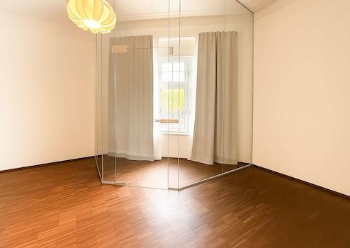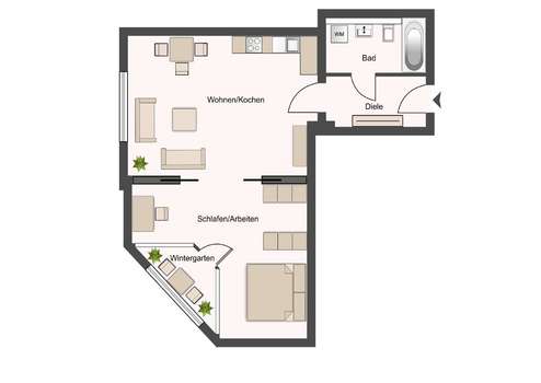 Ein besonderes Highlight sind die großen Schiebetüren, die den Wohnbereich charmant vom geräumigen Schlafzimmer trennen. Vom Schlafzimmer aus gelangt man in den Wintergarten, der zusätzlichen Raum für Entspannung oder ein kleines Homeoffice bietet.