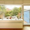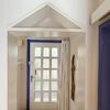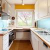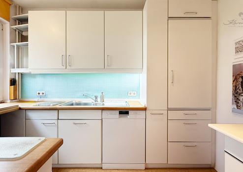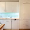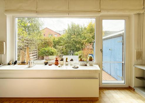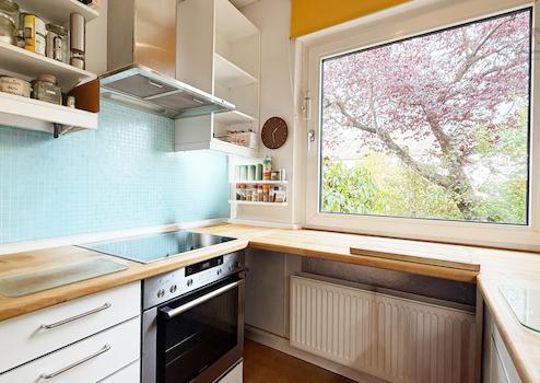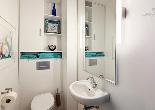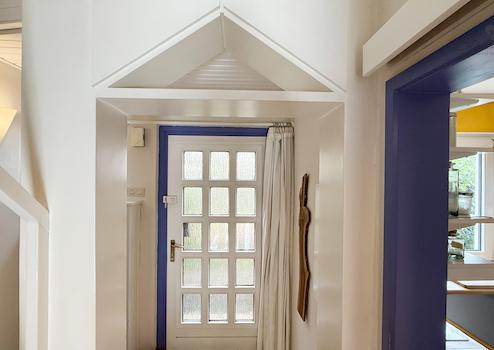 Betritt man das Haus, fallen sofort die architektonischen Details und das einheitliche Farbkonzept mit blauen und sonnig gelben Akzenten auf. Die stilvolle Spiegelwand, die den Eingangsbereich optisch vergrößert, sorgt für ein helles großzügiges Raumgefühl. Durch eine raumsparende Schiebetür betritt man linkerhand die kleine aber feine Küche, die mit viel Stauraum und Arbeitsflächen punktet und ausreichend Platz zum Kochen und Backen bietet.