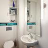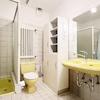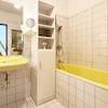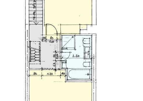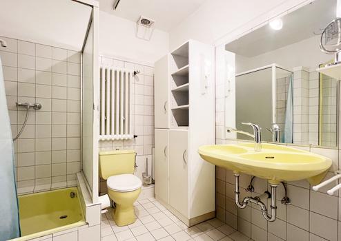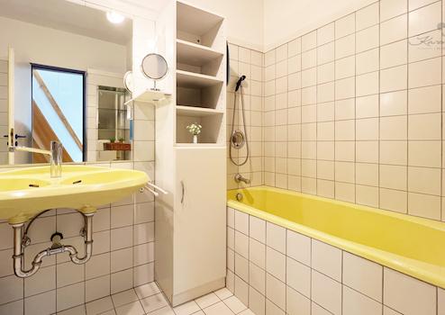 Geht man ins Obergeschoss, ist dort ein gut geschnittenes Schlafzimmer, das mit einem Einbauschrank für viel Stauraum sorgt, sowie ein zweites Zimmer, das als Kinder- oder Gästezimmer genutzt werden kann. Die Fenster können durch außenliegende Sonnensegel verschattet werden. Das Highlight für Liebhaber des Retro-Stils ist das charmante gepflegte Badezimmer: weiße Fliesen kombiniert mit gelben Sanitärelementen verleihen dem Raum eine warme, freundliche Atmosphäre. Doppelwaschbecken, Dusche und WC sorgen für praktischen Komfort.